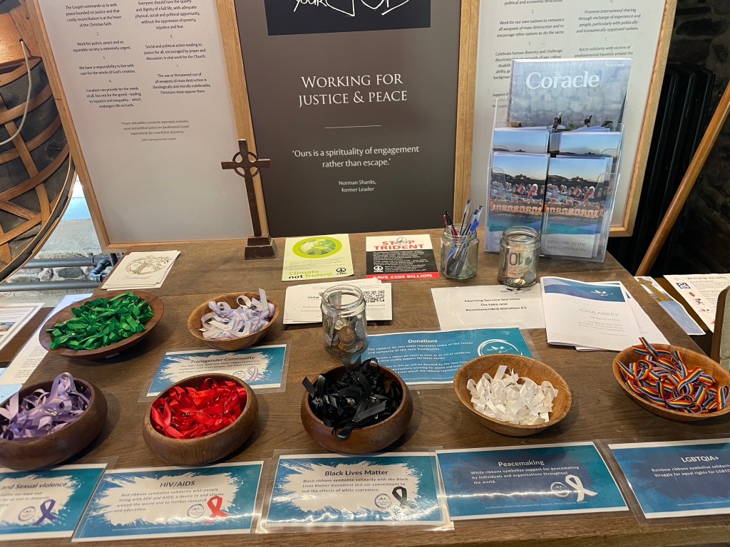 A table in the church with pins for various causes including LGBTQ2S and HIV AIDs. The church is active as an ecumenical place of workshop with a focus on community. Apparently, they have written a book of songs that is used by churches all over the world including my neighbour’s congregation.