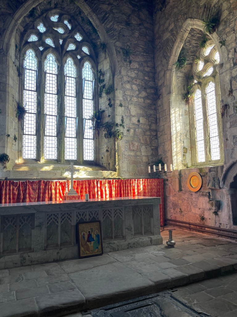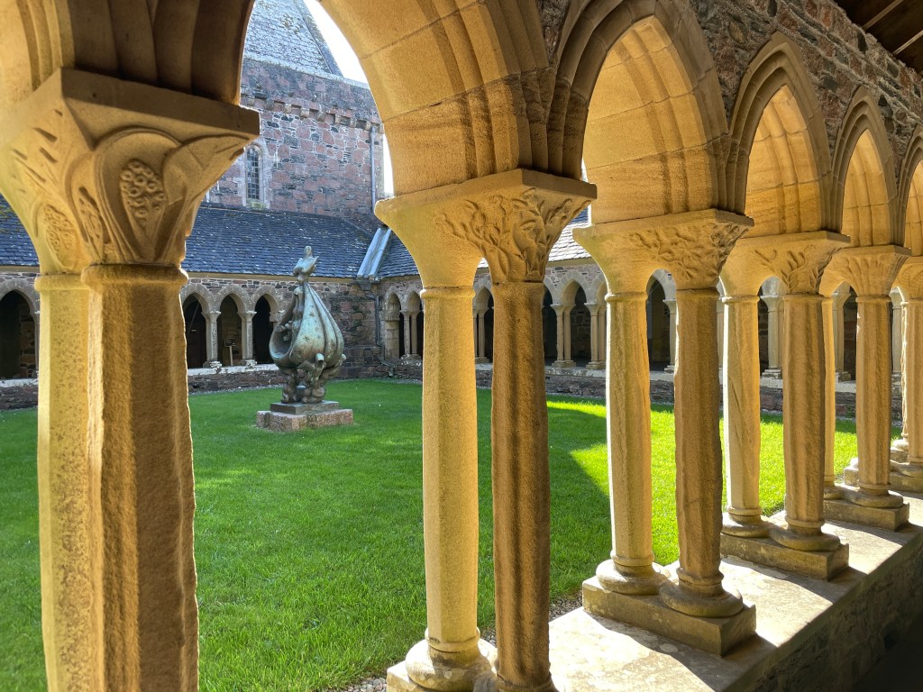 After seeing the Book of Kells in Dublin and learning that it was written by monks on Iona, at least that’s what some scholars believe, I wanted to visit the Abbey. The book is one of the earliest illuminated manuscripts of western calligraphy, a masterpiece of art and significant as most people didn’t know how to write at the time. It contains the four gospels of the new testament written around 800 AD. Fearing Viking attack and pillage, 68 monks on Iona had been killed by the Vikings, the book was taken to Ireland in or around AD 806. I was surprised how close in distance Ireland is to Iona. Nevertheless, out on the open seas must have been treacherous. We saw depictions of the large, open boats the monks rowed to Ireland.