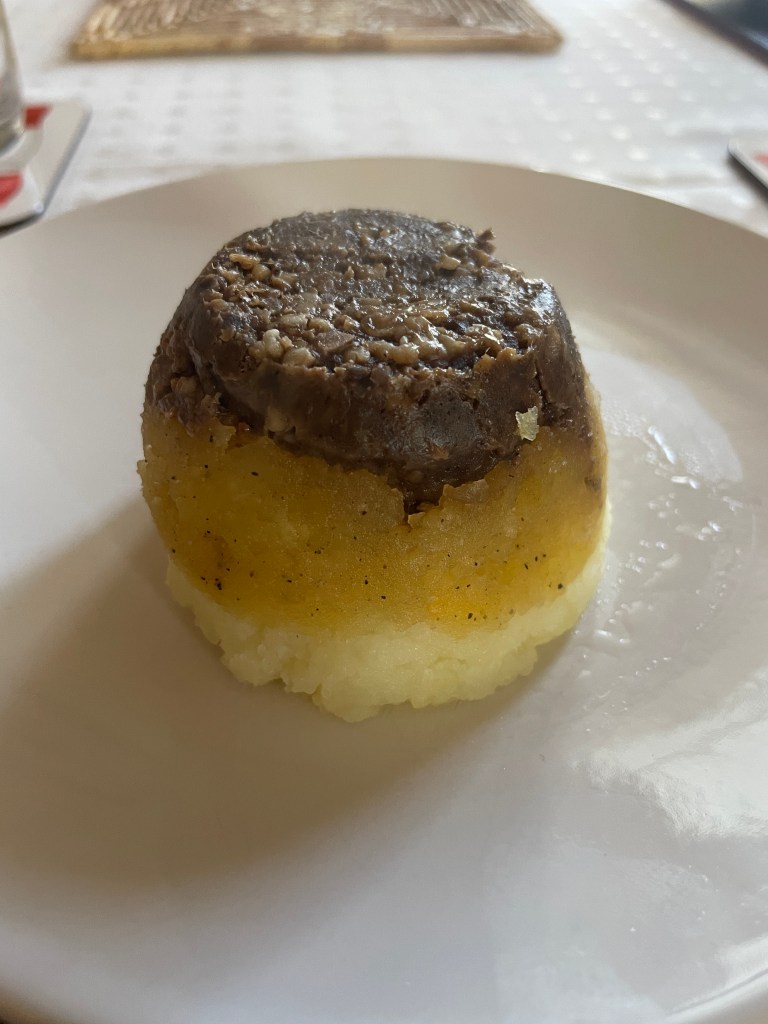 It turned out to be a ‘starter’ with haggis on top, nips or turnip in the middle and tatties or potatoes on the bottom. We liked it!