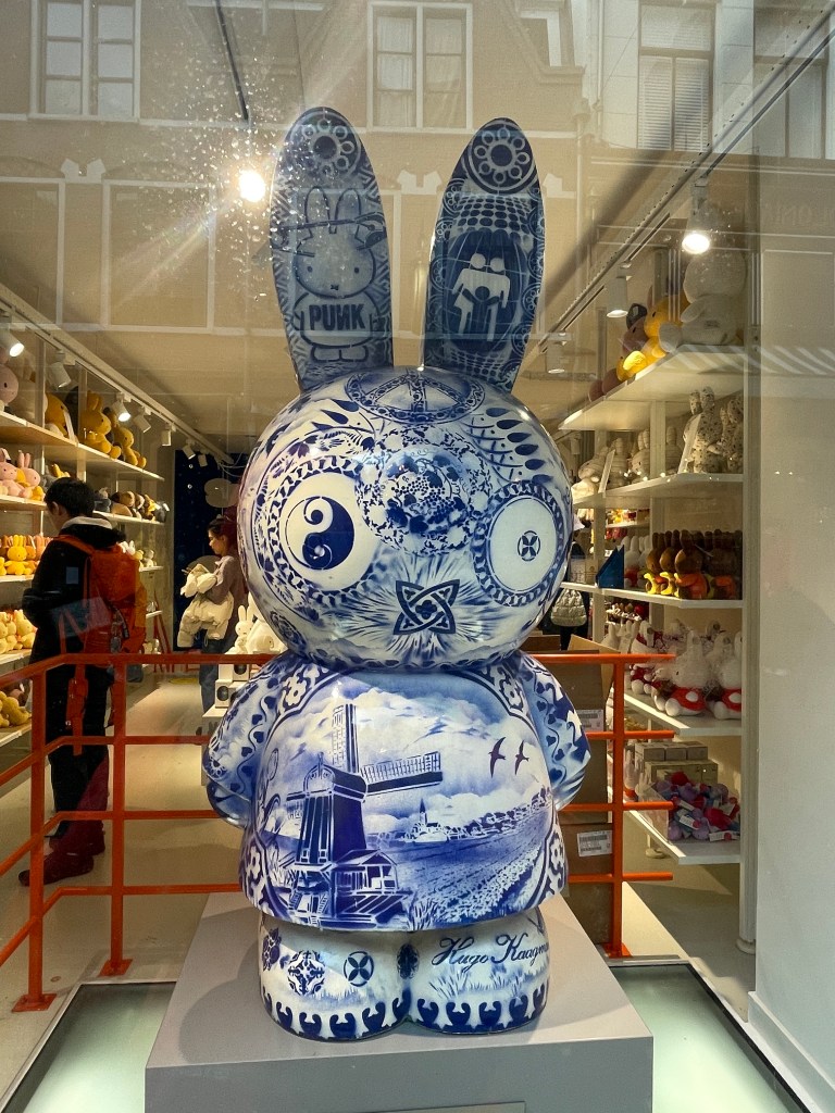 My grandparents came to Amsterdam in the 1960’s and brought everyone back a piece of Blue Delft China, mostly little windmills. Blue Delft china has been produced since the mid-1600s. This is a giant Blue Delft Miffy, a fictional rabbit appearing in a series of picture books drawn and written by Dutch artist Dick Bruna.