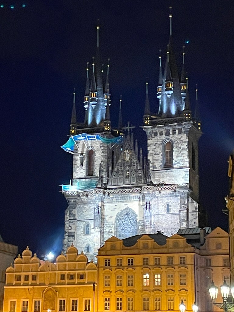 Tyn’s Church is dramatic at night looming over the Old Town square.