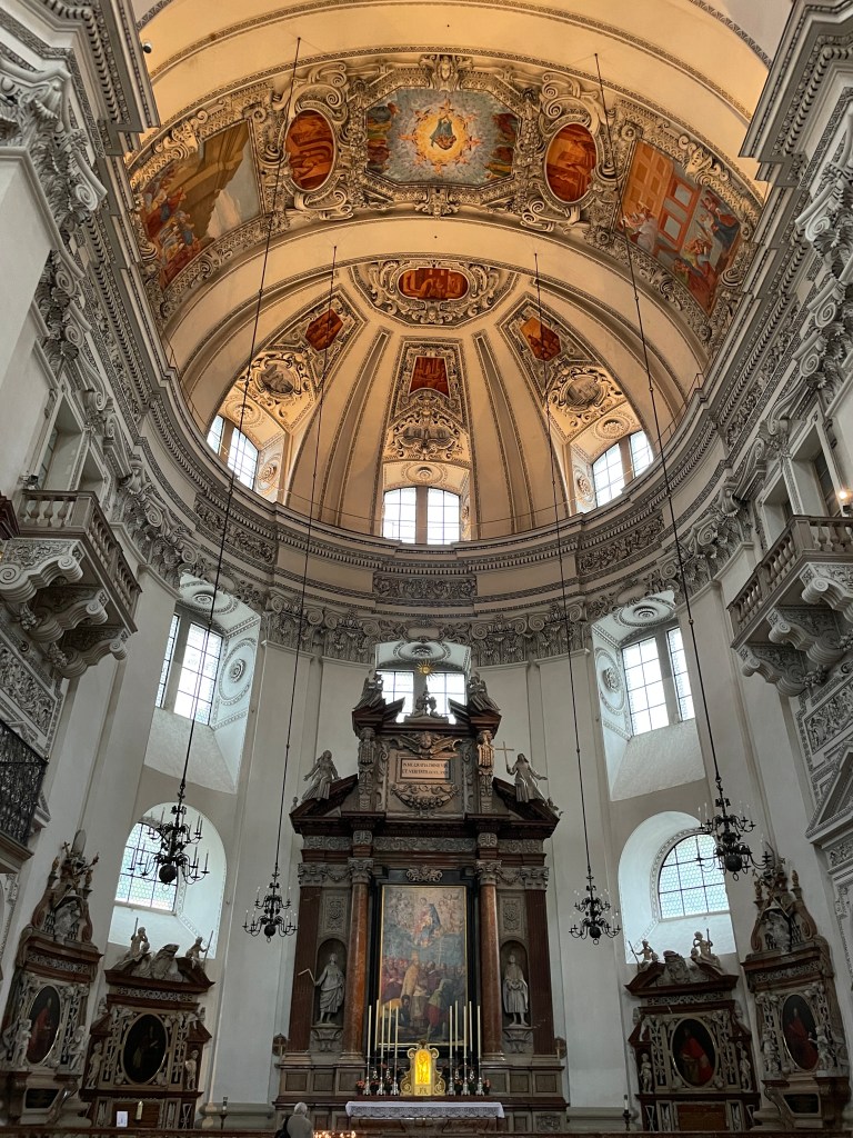 The Salzburg Cathedral dome dominates the old town. Austria’s predominant religion is Catholic and it’s one of many Catholic churches in the city.