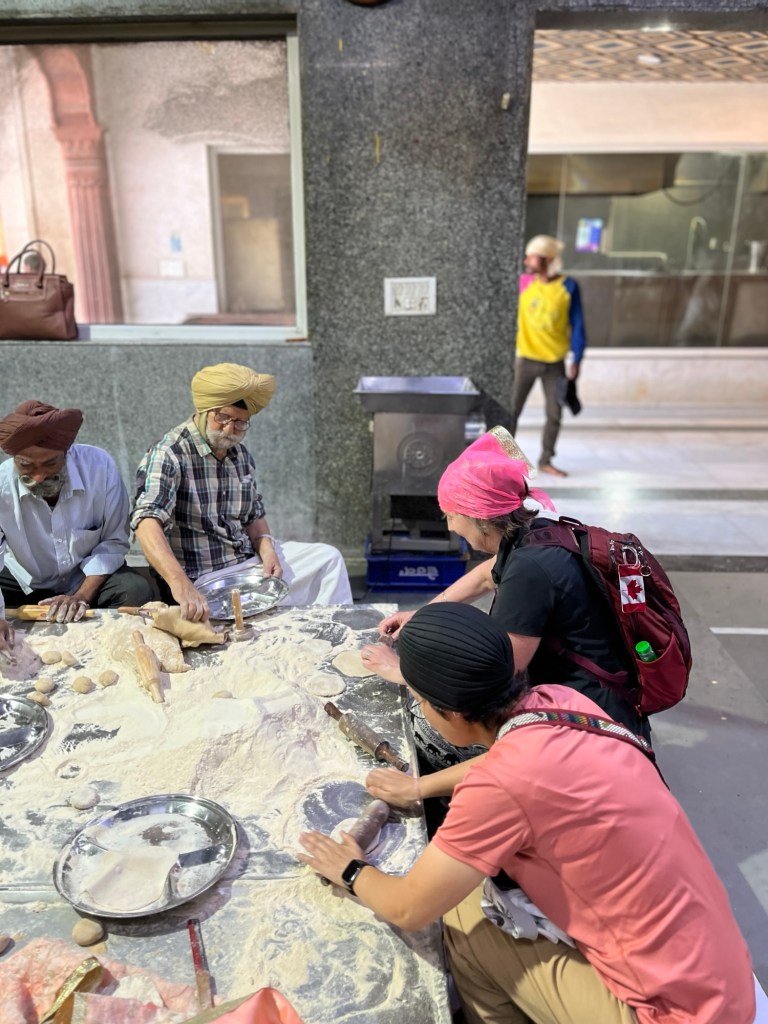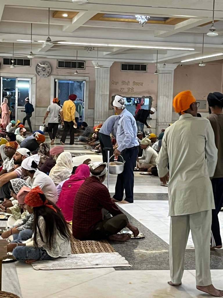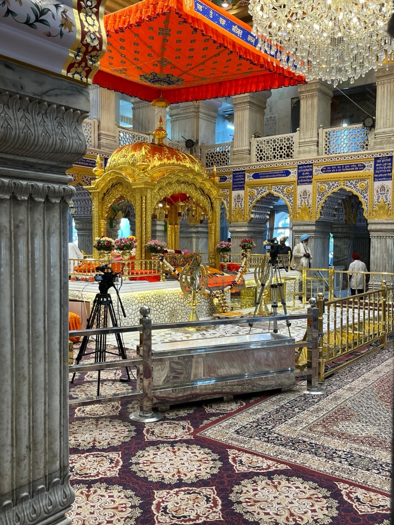 We walked down the street to Sheeshganj Gurudwara, a Sikh Temple. With our heads covered, having washed our hands and walked through a foot bath we entered the brightly lit and ornately decorated Temple. We walked with our hands clasped in front of us, found a spot and sat for a few minutes in front of the three musicians and the Dias.