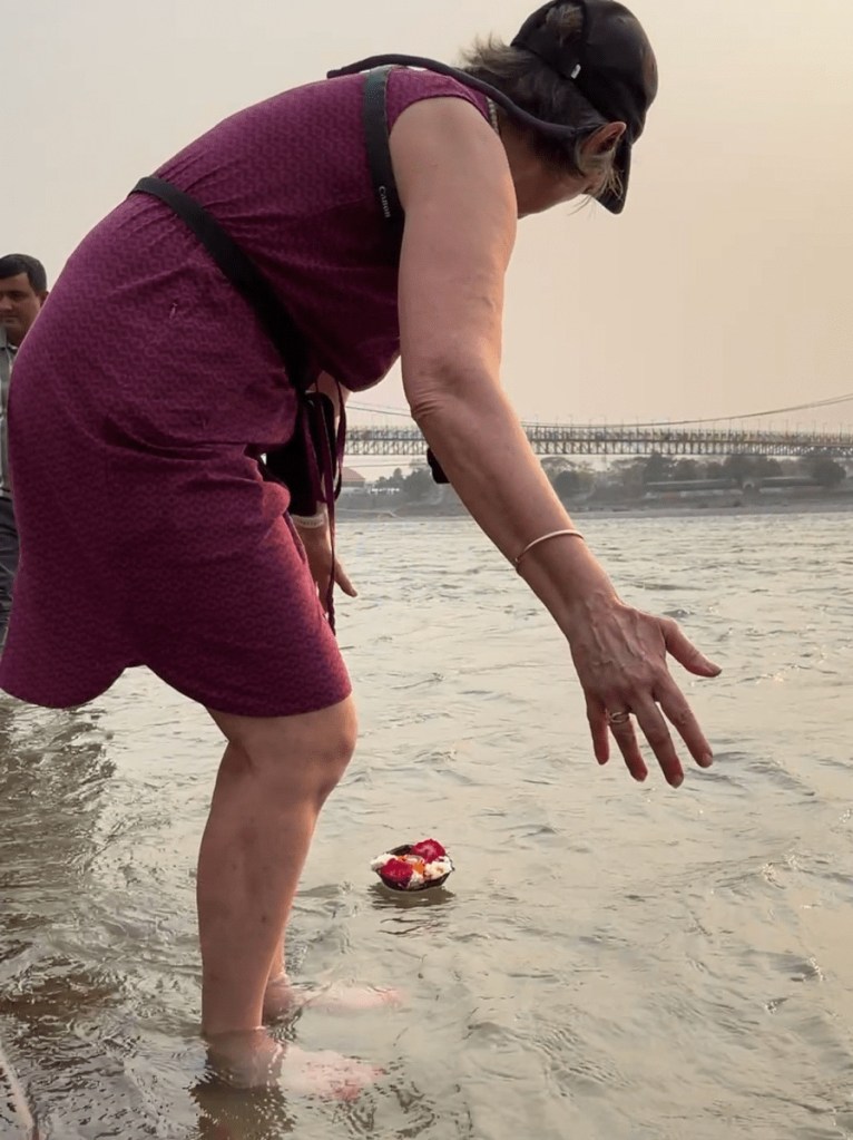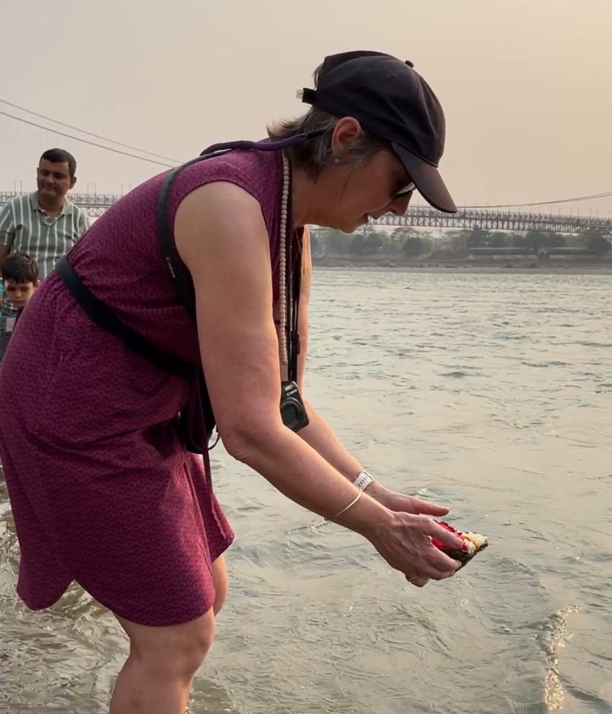 Young girls were selling baskets of flowers with incense. I bought one and Chime our guide directed me how to light it and send it down river in honour of the Goddess Ganga. She took a video of me (posted on Instagram). I edited it so you don’t see me struggling to light the incense and then slipping and nearly falling in the river!!