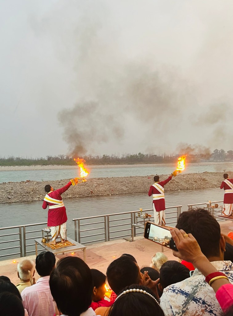 We sat on the river bank with a couple of thousand others to attend an aarti ceremony. The 14 priests first individually met with people who requested a blessing. Then each priest gives an earthen lamp fire offering in 4 directions while a band played the drums, a harmonium and sitar and sang hymn like songs. I noticed the many young people in the crowd sang along.