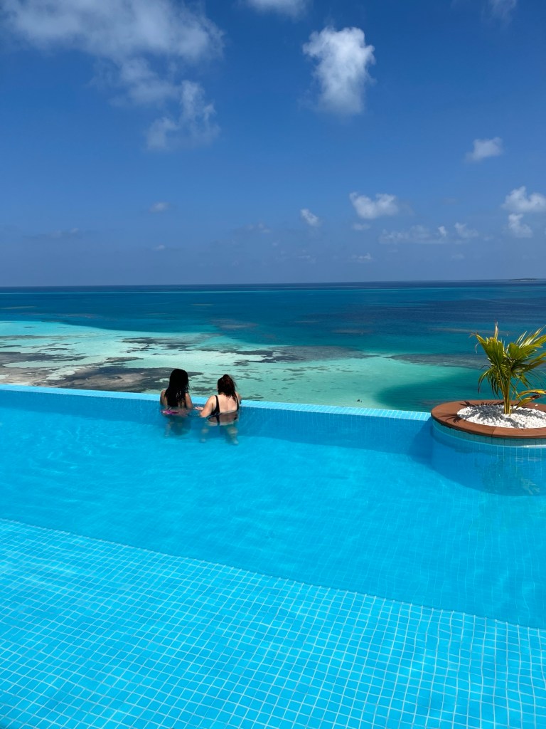 We enjoy the buffet breakfast with lots of fresh fruit. We paddle in the shallow ocean walking through sea grass and coral. We lie on the beach and order mocktails from the bar.