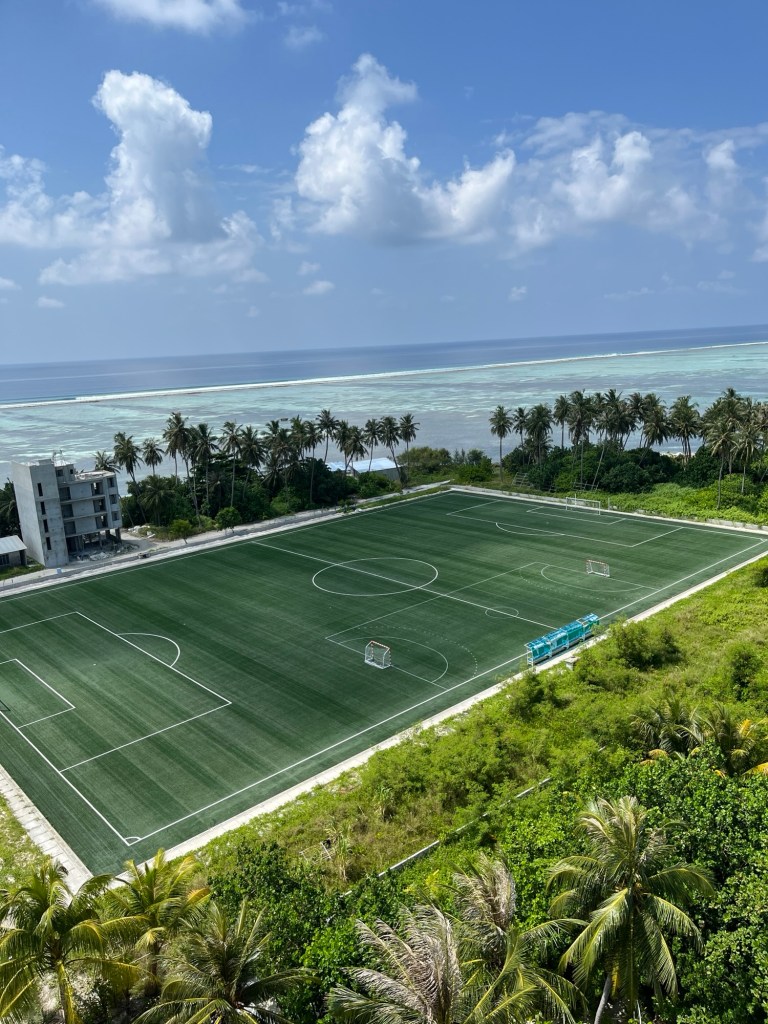 This well maintained soccer field takes up about 25% of the island! They were fogging it for mosquitos last night but no one played on it!