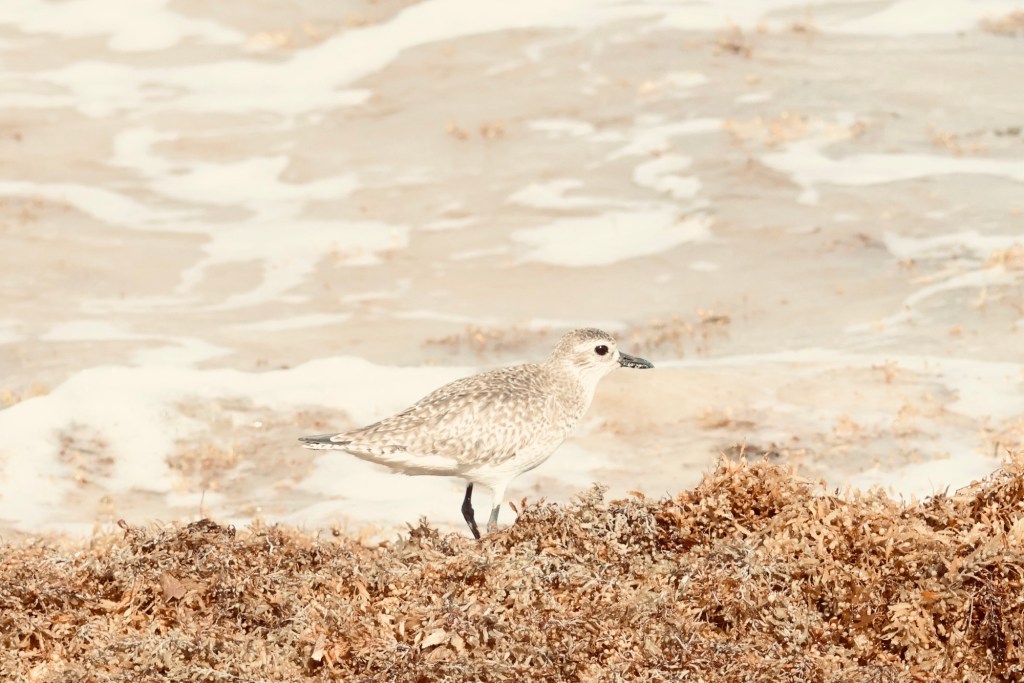 Along the water is an accumulation of a seaweed called Sargassum. It has been accumulating on beaches. it usually sits out in the ocean but due to climate change more is growing and is being washed onto the beaches. Groups of Sandpipers were camouflaged by it.
