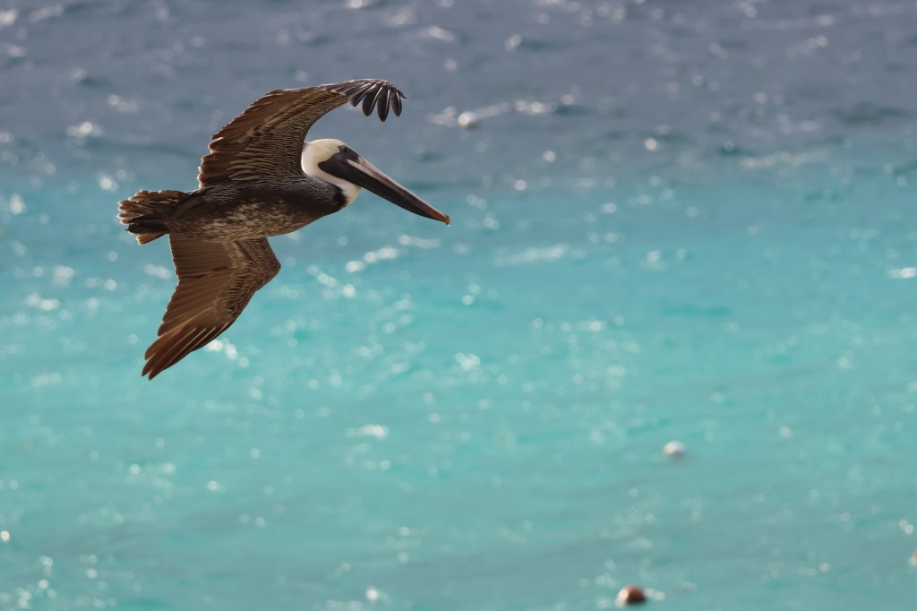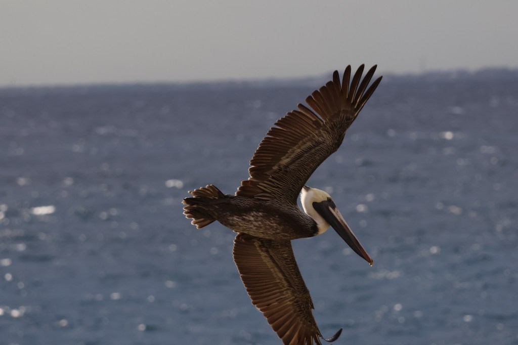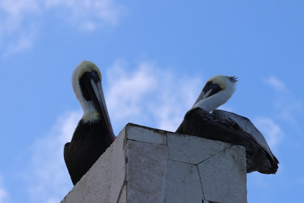Pelicans fly down the beach. Sometimes they’re alone but usually they’re in groups of two or four. They have huge beaks that are disproportionate to the rest of their body. They sit on the dock or on the roof of hotels. They fly in circles then suddenly dive into the water to catch a fish. They are funny looking creatures!