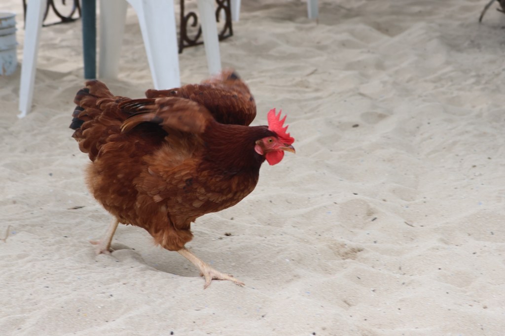 These chickens and roosters were running around. They didn’t try to steal our food but did look for scraps under the table.