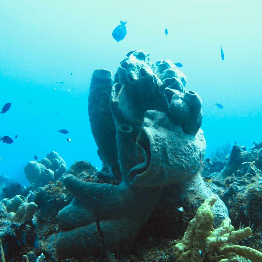 We’ve seen such beautiful landscapes in the ocean! So many different kinds, shapes and colours of sponges. There are purple and red and yellow and blue – really all the colours in the rainbow. Sponges aren’t plants. They’re actually invertebrate animals.
